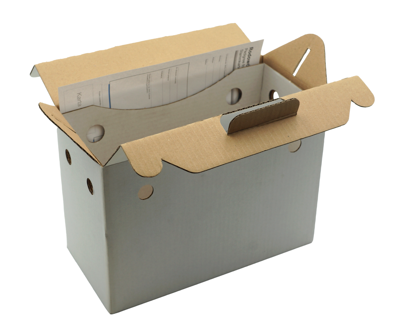 Pudełko wykonane jest z wytrzymałej, wielowarstwowej tektury o podwyższonej sztywności ( 530 g/ m²) , co zapewnia bezpieczeństwo ptaka podczas transportu. Konstrukcja została opracowana tak, aby łączyć lekkość z odpowiednią stabilnością – cechy szczególnie istotne w hodowli gołębi pocztowych.